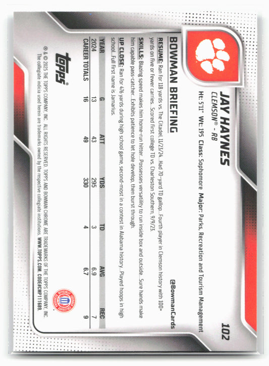 This is a nice example of a 2025 Bowman University Chrome #102 Jay Haynes Other important information about this card:In 2025 Jay Haynes played for the Clemson Tigers.Please check out...