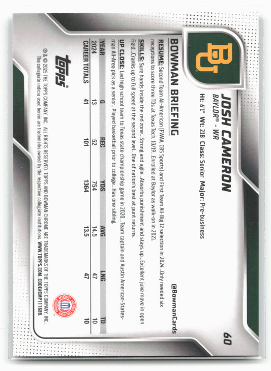 This is a nice example of a 2025 Bowman University Chrome #60 Josh Cameron Other important information about this card:In 2025 Josh Cameron played for the Baylor Bears.Please check out...