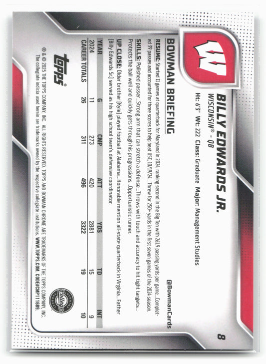 This is a nice example of a 2025 Bowman University Chrome #8 Billy Edwards Jr. Other important information about this card:In 2025 Billy Edwards Jr. played for the Wisconsin Badgers.Please...