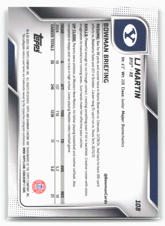 This is a nice example of a 2025 Bowman University Chrome #108 LJ Martin Other important information about this card:In 2025 LJ Martin played for the BYU Cougars.Please check out...