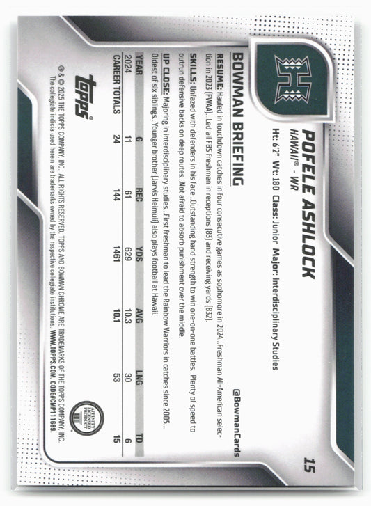 This is a nice example of a 2025 Bowman University Chrome #15 Pofele Ashlock Other important information about this card:In 2025 Pofele Ashlock played for the Hawaii Rainbow Warriors.Please check...