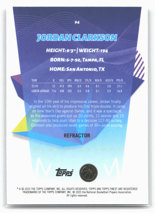 This is a nice example of a 2024-25 Finest #94 Jordan Clarkson Refractor Other important information about this card:19892In 2024 Jordan Clarkson played for the Utah Jazz.Please check out our...
