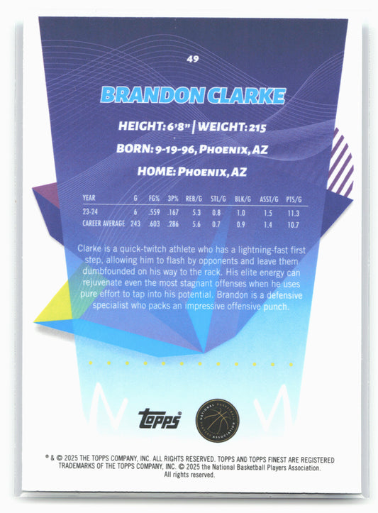 This is a nice example of a 2024-25 Finest #49 Brandon Clarke Sky Blue Refractor Other important information about this card:19893In 2024 Brandon Clarke played for the Memphis Grizzlies.Please check...