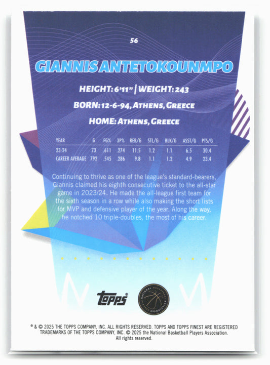 This is a nice example of a 2024-25 Finest #56 Giannis Antetokounmpo Other important information about this card:19818In 2024 Giannis Antetokounmpo played for the Milwaukee Bucks.Please check out our other...