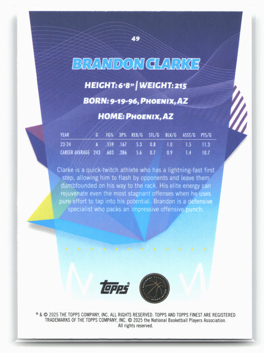 This is a nice example of a 2024-25 Finest #49 Brandon Clarke Other important information about this card:In 2024 Brandon Clarke played for the Memphis Grizzlies.Please check out our other...