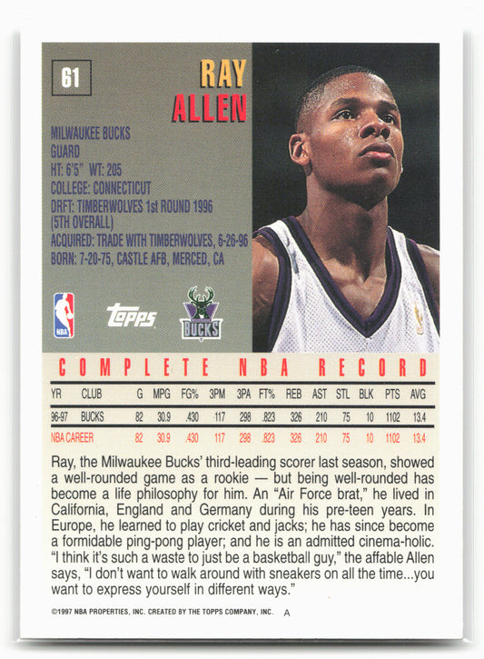 This is a nice example of a 1997-98 Topps #61 Ray Allen Other important information about this card:In 1997 Ray Allen played for the Milwaukee Bucks.Please check out our other...