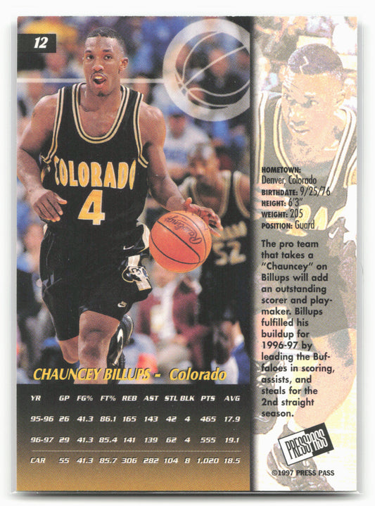 This is a nice example of a 1997 Press Pass #12 Chauncey Billups Blue Torquers Other important information about this card:In 1997 Chauncey Billups played for the Colorado Buffaloes.Please check...