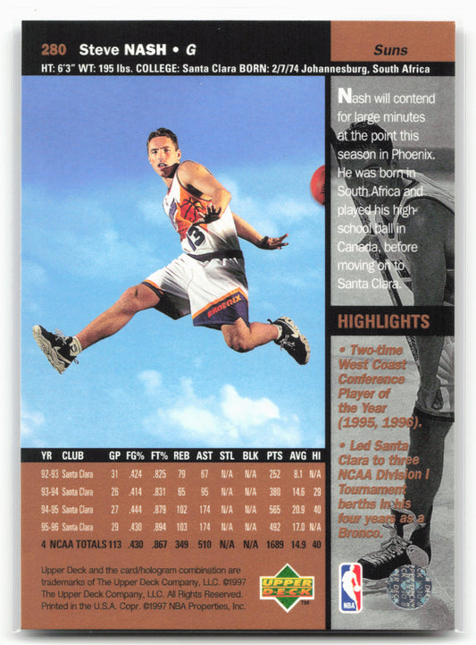 This is a nice example of a 1996-97 Upper Deck #280 Steve Nash Other important information about this card:RCIn 1996 Steve Nash played for the Phoenix Suns.Please check out our...