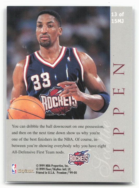 This is a nice example of a 1999-00 SkyBox Premium #13MJ Scottie Pippen Majestic Other important information about this card:In 1999 Scottie Pippen played for the Houston Rockets.Please check out...