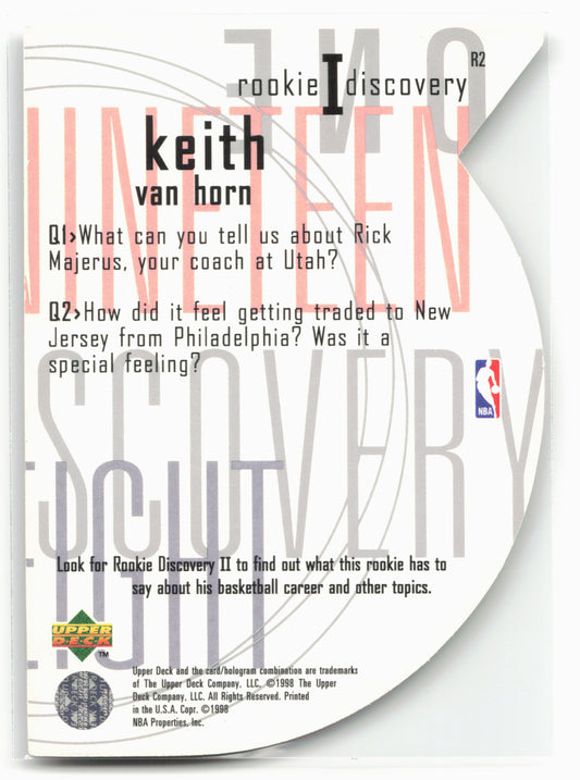 This is a nice example of a 1997-98 Upper Deck #R2 Keith Van Horn Rookie Discovery I Other important information about this card:In 1997 Keith Van Horn played for the...