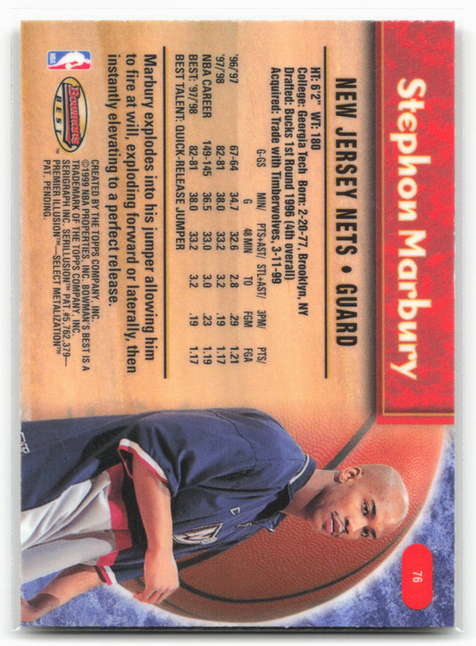 This is a nice example of a 1998-99 Bowman's Best #76 Stephon Marbury Other important information about this card:In 1998 Stephon Marbury played for the New Jersey Nets.Please check out...