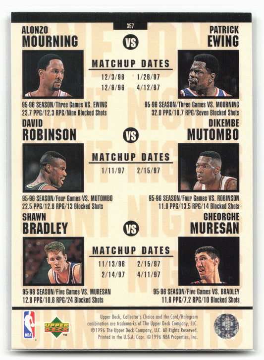 This is a nice example of a 1996-97 Collector's Choice #357 Olajuwon/O'Neal/Mourning/Ewing/Robinson/Dikembe Mutombo Other important information about this card:In 1996 Olajuwon/O'Neal/Mourning/Ewing/Robinson/Dikembe Mutombo played for the NBA.Please check out our other...