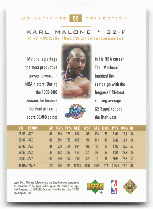 This is a nice example of a 2000-01 Upper Deck Ultimate Collection #55 Karl Malone Other important information about this card:SNIn 2000 Karl Malone played for the Utah Jazz.Please check...