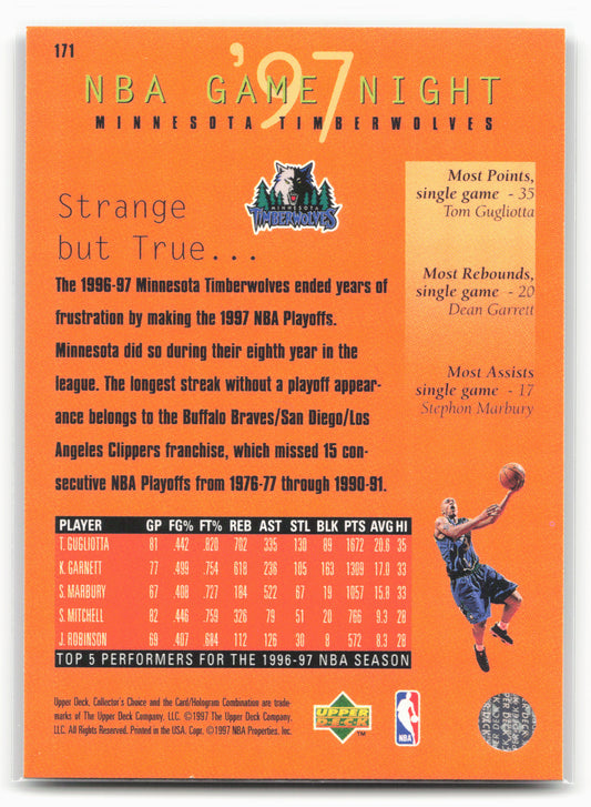 This is a nice example of a 1997-98 Collector's Choice #171 Minnesota Timberwolves Other important information about this card:In 1997 Minnesota Timberwolves played for the Minnesota Timberwolves.Please check out our...