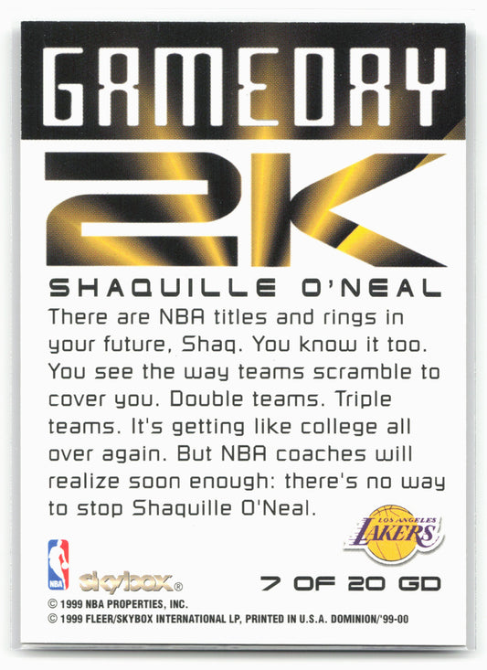 This is a nice example of a 1999-00 SkyBox Dominion #7 GD Shaquille O'Neal Game Day 2K Other important information about this card:In 1999 Shaquille O'Neal played for the Los...