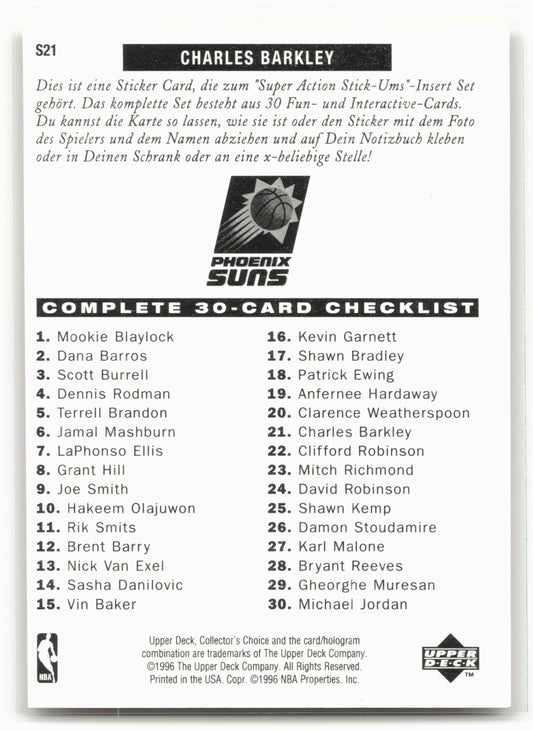 This is a nice example of a 1996-97 Collector's Choice Italian #S21 Charles Barkley Super Action Stick 'Ums Other important information about this card:In 1996 Charles Barkley played for the...