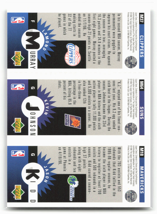 This is a nice example of a 1996-97 Collector's Choice #M18 / M64 / M37 Jason Kidd / Kevin Johnson / Lamond Murray Mini-Cards Panels Other important information about this...