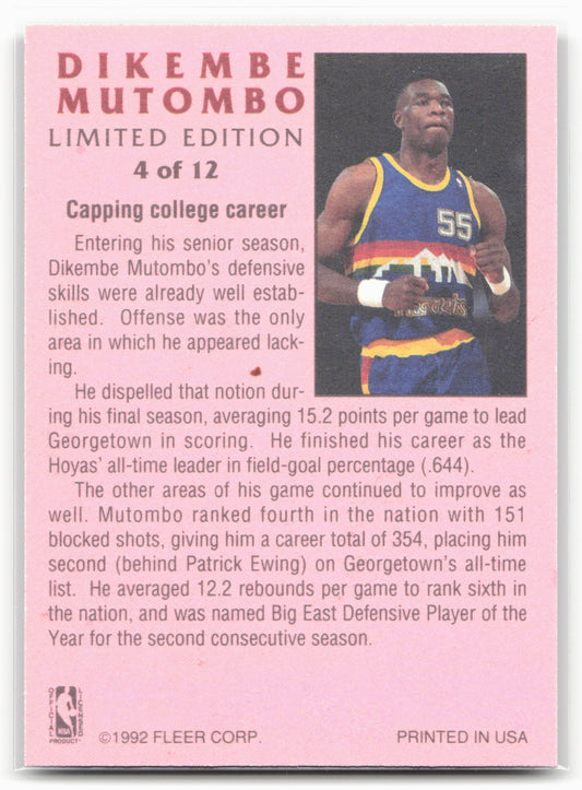 This is a nice example of a 1991-92 Fleer #4 Dikembe Mutombo Dikembe Mutombo Limited Edition Other important information about this card:In 1991 Dikembe Mutombo played for the Denver Nuggets.Please...
