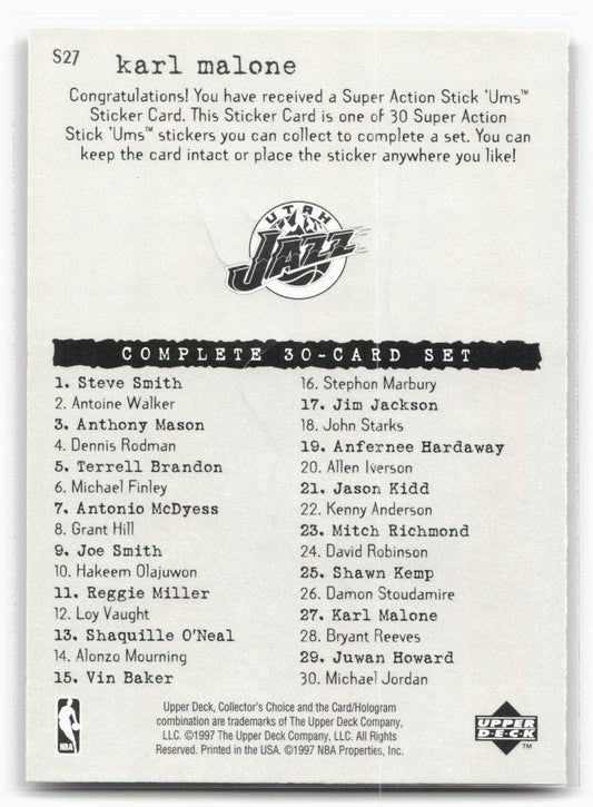 This is a nice example of a 1997-98 Collector's Choice #S27 Karl Malone Super Action Stick 'Ums Other important information about this card:In 1997 Karl Malone played for the Utah...