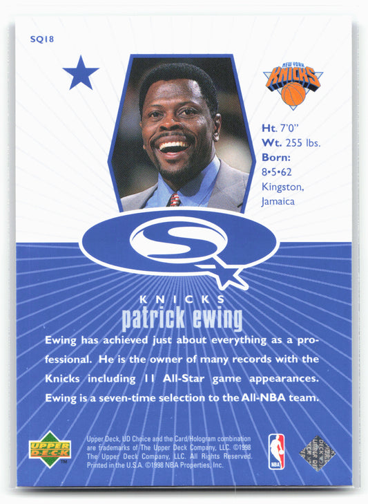 This is a nice example of a 1998-99 UD Choice #SQ18 Patrick Ewing StarQuest Blue Other important information about this card:In 1998 Patrick Ewing played for the New York Knicks.Please...