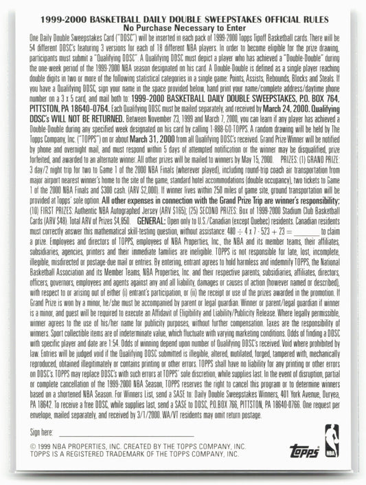 This is a nice example of a 1999-00 Topps Tipoff #NNO Shaquille O'Neal Daily Double Other important information about this card:1114-1120;In 1999 Shaquille O'Neal played for the Los Angeles Lakers.Please...