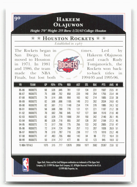 This is a nice example of a 1999-00 Upper Deck Victory #90 Hakeem Olajuwon Other important information about this card:In 1999 Hakeem Olajuwon played for the Houston Rockets.Please check out...