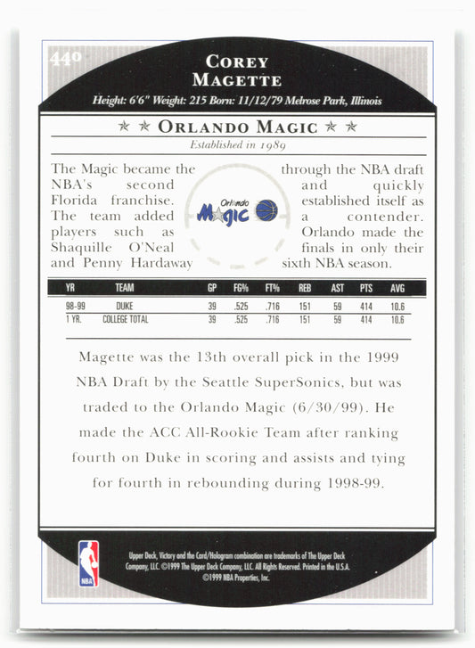 This is a nice example of a 1999-00 Upper Deck Victory #440 Corey Maggette Other important information about this card:RCIn 1999 Corey Maggette played for the Orlando Magic.Please check out...