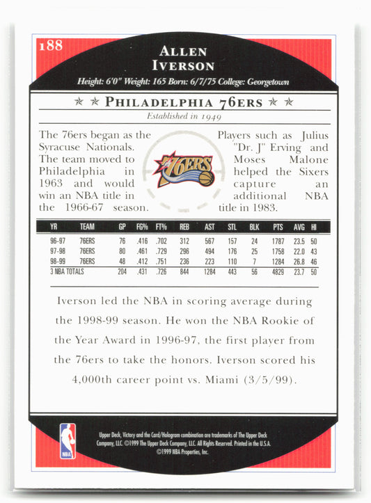 This is a nice example of a 1999-00 Upper Deck Victory #188 Allen Iverson Other important information about this card:In 1999 Allen Iverson played for the Philadelphia 76ers.Please check out...