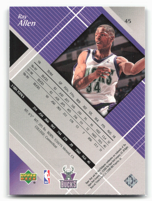This is a nice example of a 1999-00 Upper Deck Black Diamond #45 Ray Allen Other important information about this card:In 1999 Ray Allen played for the Milwaukee Bucks.Please check...