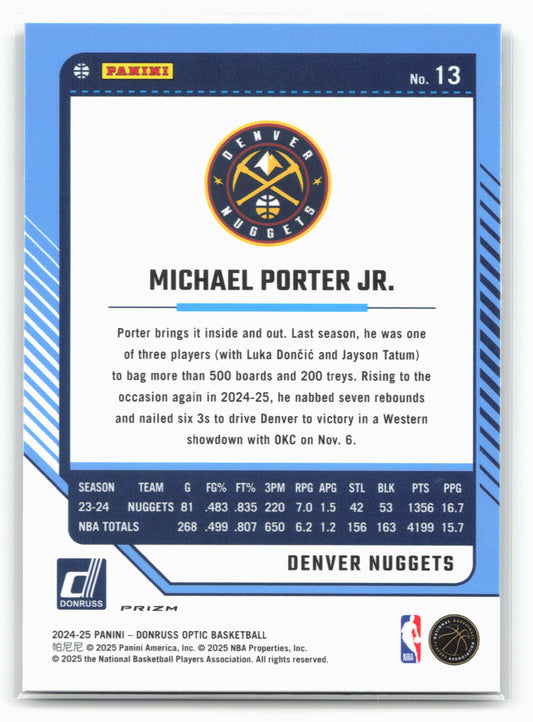 This is a nice example of a 2024-25 Donruss Optic #13 Michael Porter Jr. Purple Shock Other important information about this card:In 2024 Michael Porter Jr. played for the Denver...