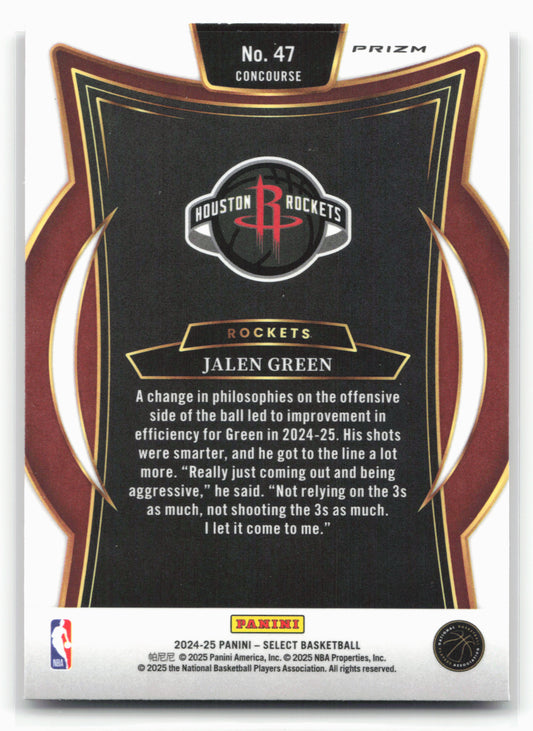This is a nice example of a 2024-25 Panini Select #47 Jalen Green Red Cracked Ice Prizm Other important information about this card:In 2024 Jalen Green played for the Houston...