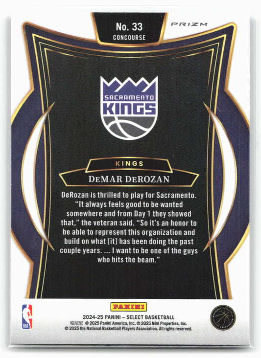 This is a nice example of a 2024-25 Panini Select #33 DeMar DeRozan Silver Prizm Other important information about this card:In 2024 DeMar DeRozan played for the Sacramento Kings.Please check...