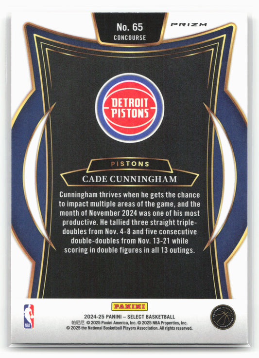 This is a nice example of a 2024-25 Panini Select #65 Cade Cunningham Red Cracked Ice Prizm Other important information about this card:In 2024 Cade Cunningham played for the Detroit...