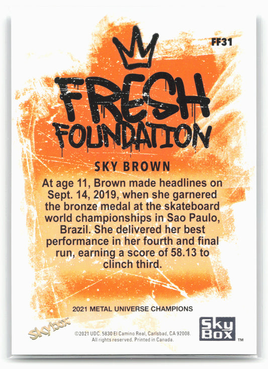 This is a nice example of a 2021 SkyBox Metal Universe Champions #FF31 Sky Brown Fresh Foundation Other important information about this card:In 2021 Sky Brown played for the Skybox.Please...