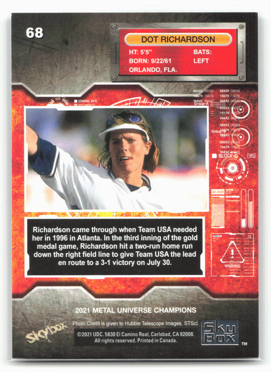 This is a nice example of a 2021 SkyBox Metal Universe Champions #68 Dot Richardson Other important information about this card:In 2021 Dot Richardson played for the Seattle Seahawks.Please check...