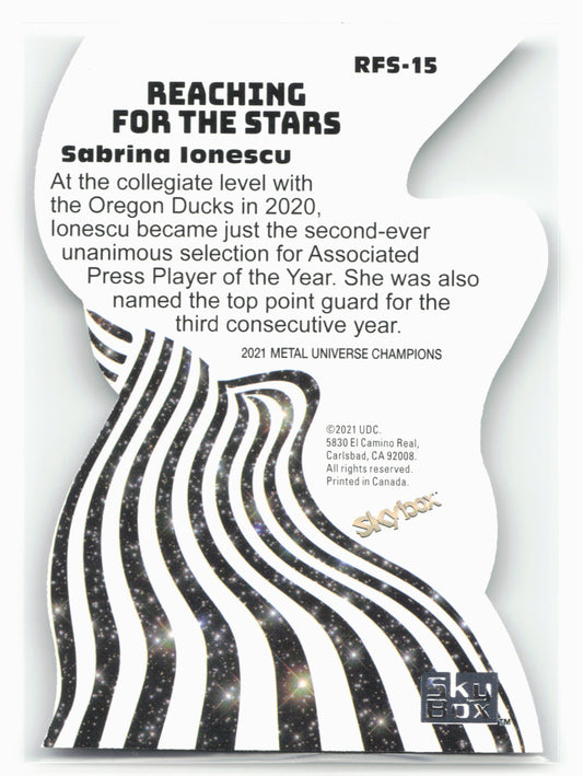 This is a nice example of a 2021 SkyBox Metal Universe Champions #RFS-15 Sabrina Ionescu Reaching for the Stars Other important information about this card:In 2021 Sabrina Ionescu played for...