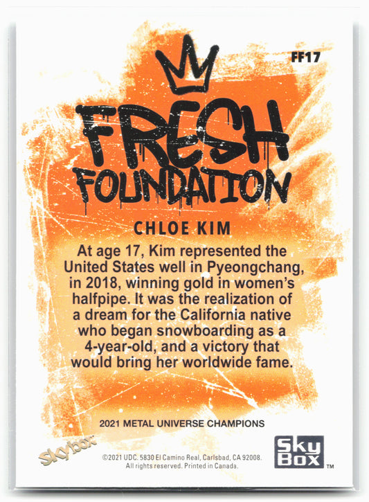 This is a nice example of a 2021 SkyBox Metal Universe Champions #FF17 Chloe Kim Fresh Foundation Other important information about this card:In 2021 Chloe Kim played for the Skybox.Please...