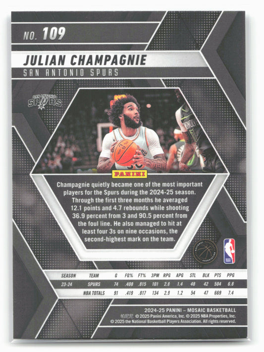 This is a nice example of a 2024-25 Panini Mosaic #109 Julian Champagnie Other important information about this card:In 2024 Julian Champagnie played for the San Antonio Spurs.Please check out...