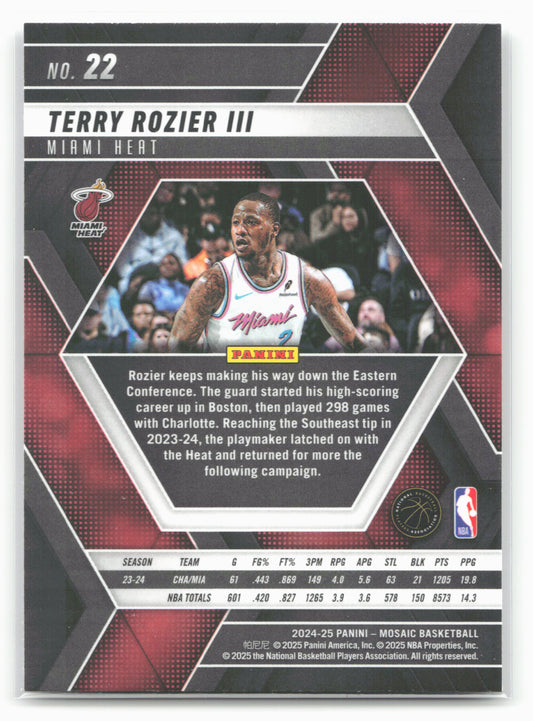 This is a nice example of a 2024-25 Panini Mosaic #22 Terry Rozier III Other important information about this card:In 2024 Terry Rozier III played for the Miami Heat.Please check...