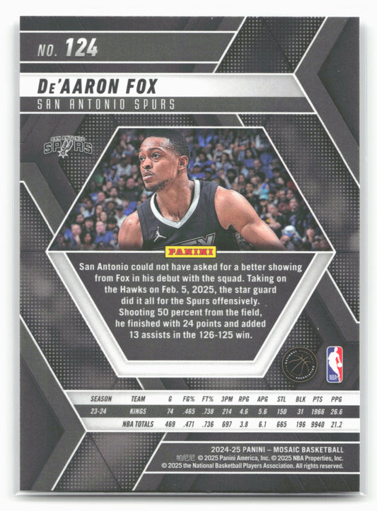 This is a nice example of a 2024-25 Panini Mosaic #124 De’Aaron Fox Other important information about this card:In 2024 De’Aaron Fox played for the San Antonio Spurs.Please check out...