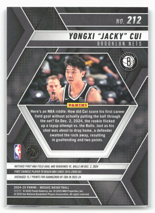 This is a nice example of a 2024-25 Panini Mosaic #212 Yongxi "Jacky" Cui Other important information about this card:RCIn 2024 Yongxi "Jacky" Cui played for the Brooklyn Nets.Please check...