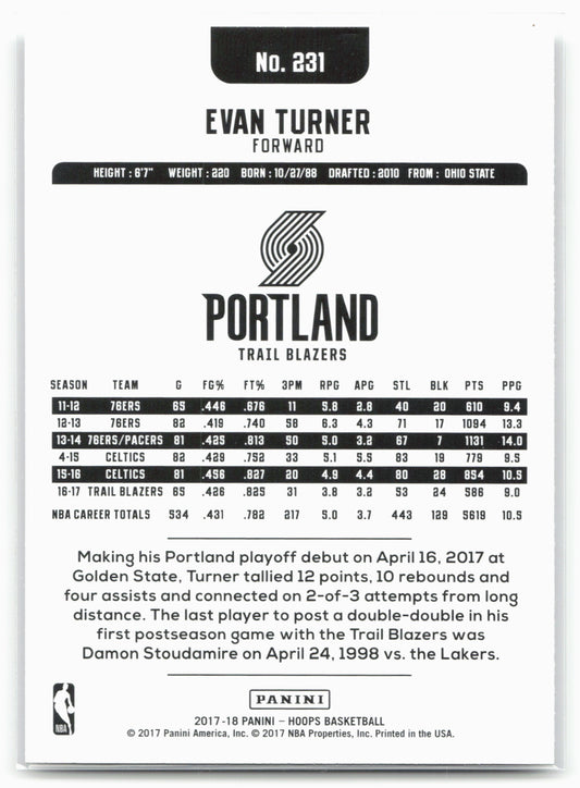 This is a nice example of a 2017-18 Hoops #231 Evan Turner Other important information about this card:In 2017 Evan Turner played for the Portland Trail Blazers.Please check out our...