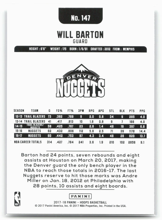 This is a nice example of a 2017-18 Hoops #147 Will Barton Other important information about this card:In 2017 Will Barton played for the Denver Nuggets.Please check out our other...