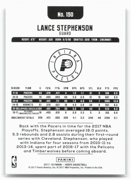 This is a nice example of a 2017-18 Hoops #150 Lance Stephenson Other important information about this card:In 2017 Lance Stephenson played for the Indiana Pacers.Please check out our other...