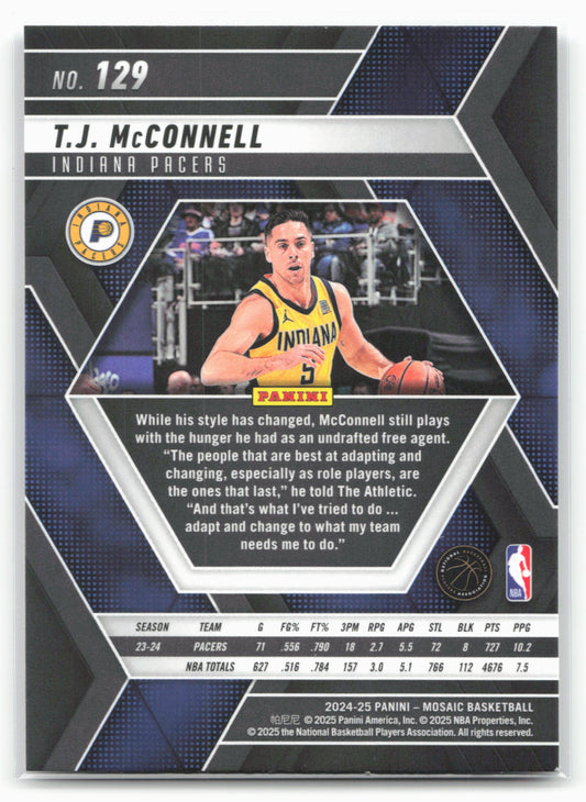 This is a nice example of a 2024-25 Panini Mosaic #129 T.J. McConnell Other important information about this card:In 2024 T.J. McConnell played for the Indiana Pacers.Please check out our...