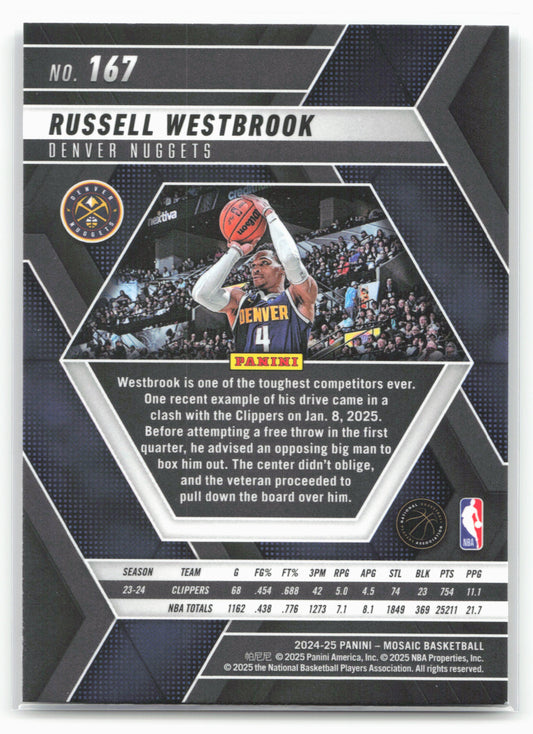 This is a nice example of a 2024-25 Panini Mosaic #167 Russell Westbrook Other important information about this card:In 2024 Russell Westbrook played for the Denver Nuggets.Please check out our...