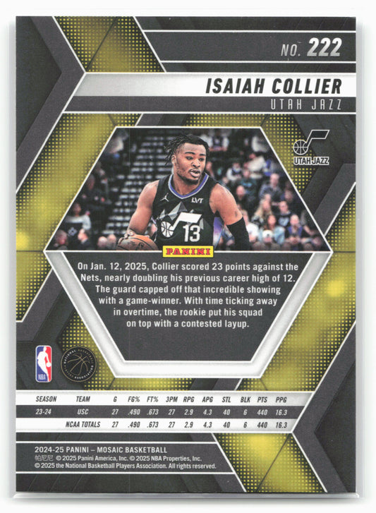 This is a nice example of a 2024-25 Panini Mosaic #222 Isaiah Collier Other important information about this card:RCIn 2024 Isaiah Collier played for the Utah Jazz.Please check out our...