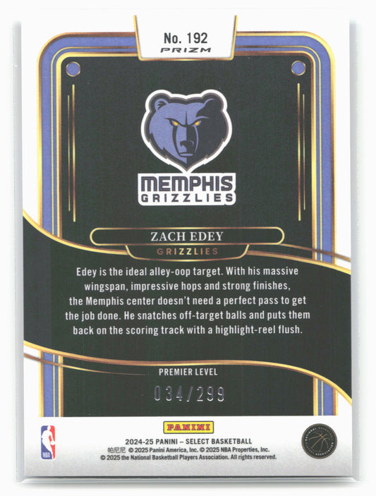 This is a nice example of a 2024-25 Panini Select #192 Zach Edey Light Blue Prizm Other important information about this card:SN,RCIn 2024 Zach Edey played for the Memphis Grizzlies.Please...