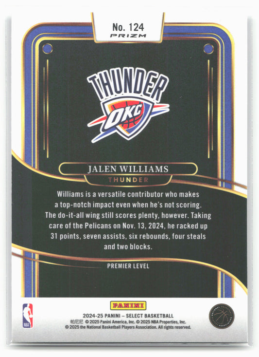 This is a nice example of a 2024-25 Panini Select #124 Jalen Williams Silver Prizm Other important information about this card:In 2024 Jalen Williams played for the Oklahoma City Thunder.Please...