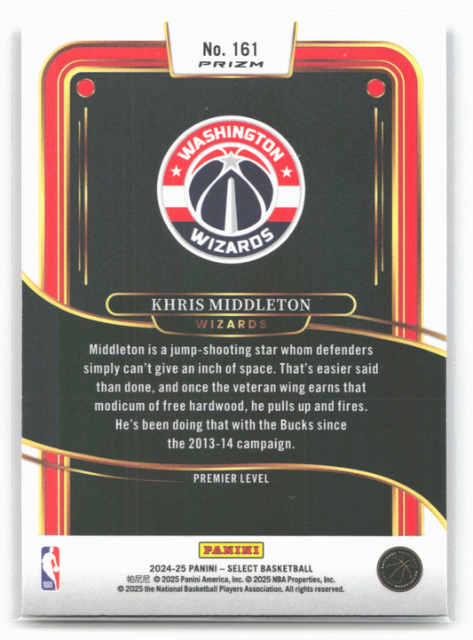 This is a nice example of a 2024-25 Panini Select #161 Khris Middleton Tri-Color Prizm Other important information about this card:In 2024 Khris Middleton played for the Washington Wizards.Please check...